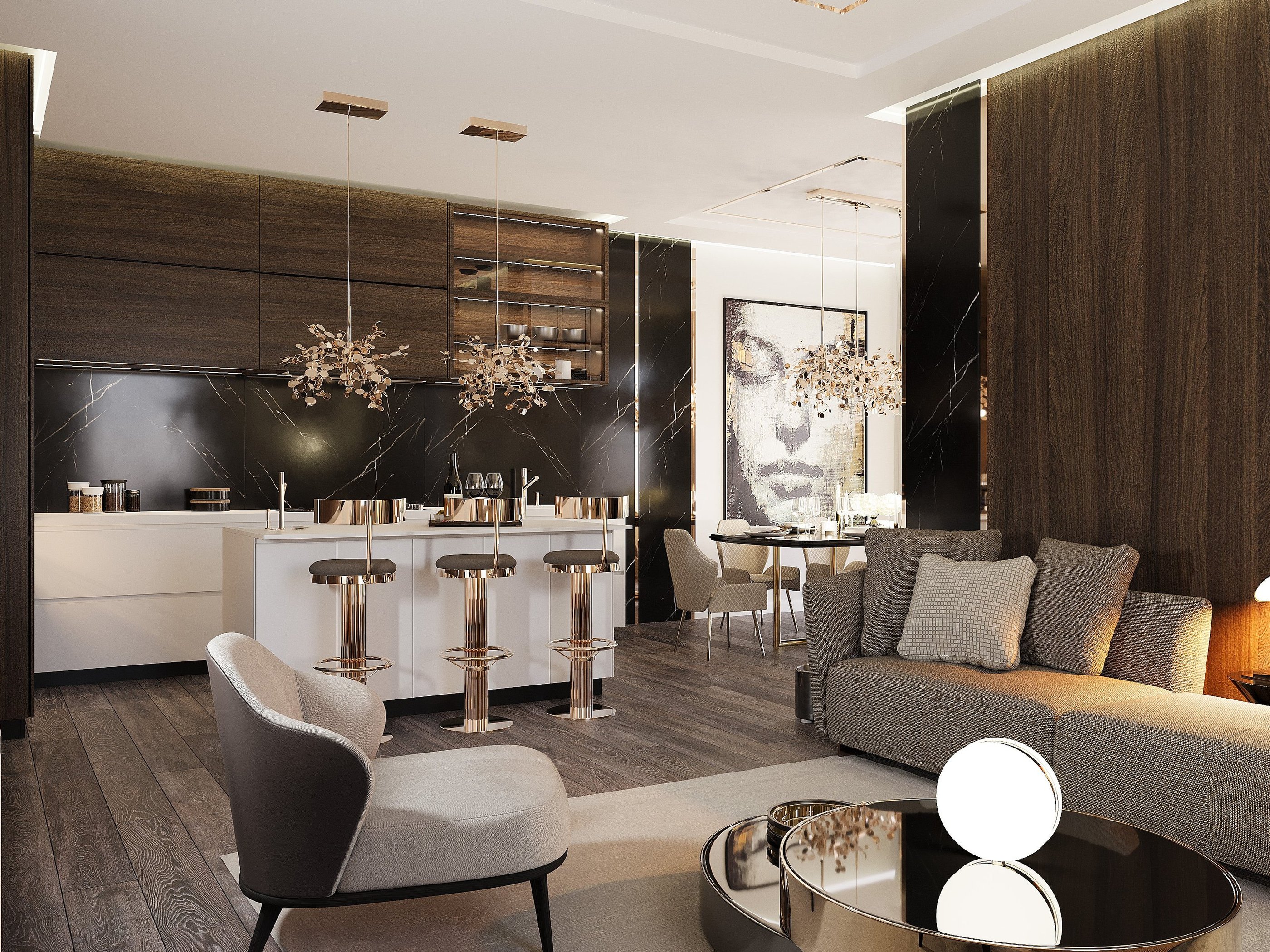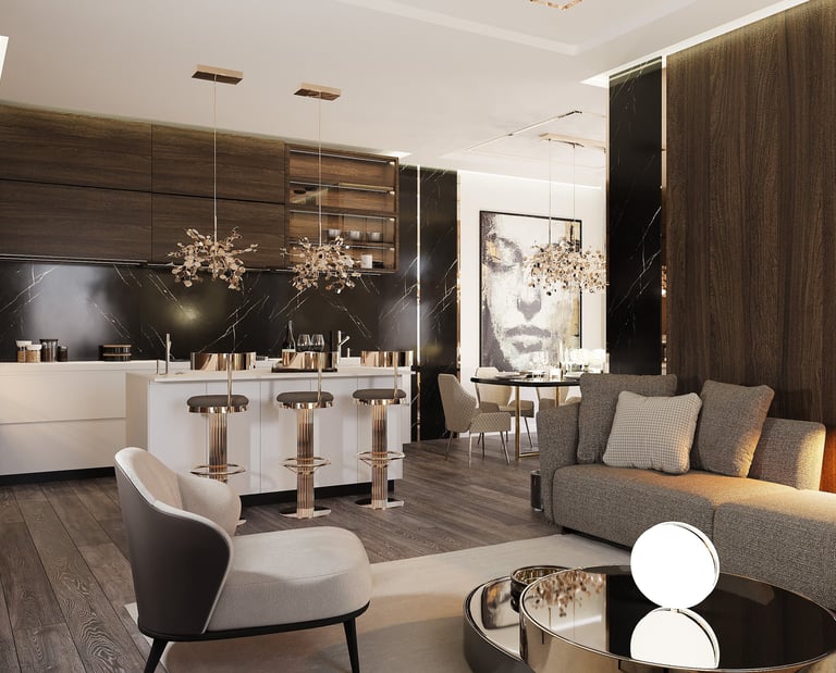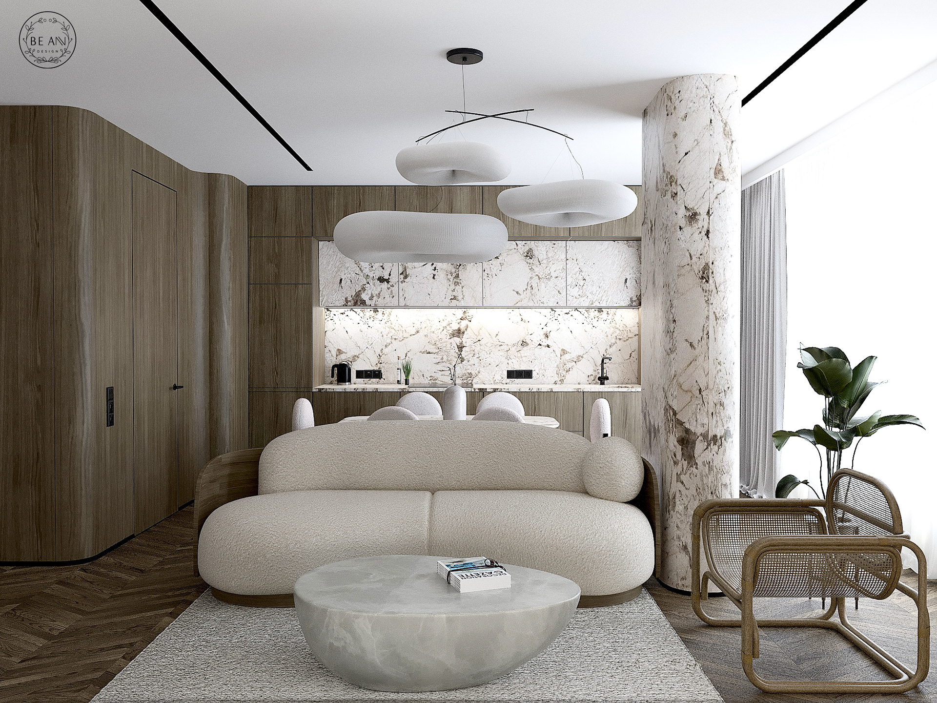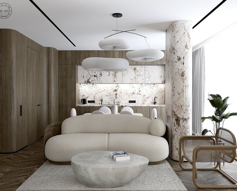 Przestronny salon z aneksem kuchennym łączy szlachetne szarości, drewno i marmur w spójną, harmonijną całość. Miękka, zaokrąglona sofa i lampy w formie białych chmurek dodają lekkości, tworząc przytulne, a zarazem nowoczesne wnętrze.