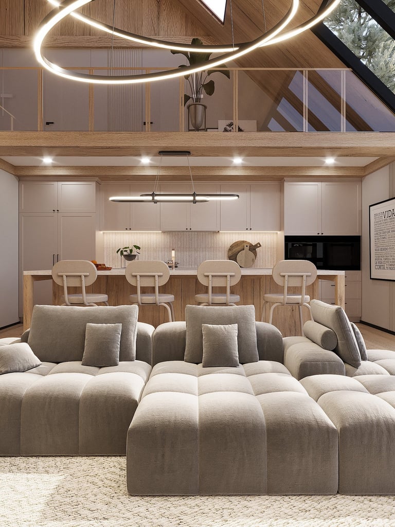 Pokój dzienny z aneksem kuchennym w ekologicznym stylu zachwyca naturalnymi materiałami i przestrzenią otwartą na dwa poziomy. Duże, skośne okna wypełniają wnętrze światłem, a harmonia szarości, beżu i drewna tworzy ciepły, nowoczesny klimat.