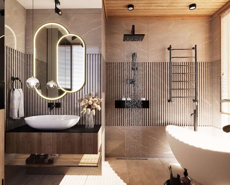 To wnętrze łazienki łączy nowoczesny minimalizm z ciepłymi, naturalnymi akcentami. Subtelne oświetlenie, drewniane elementy oraz pionowa struktura płytek nadają przestrzeni harmonii i elegancji. Wolnostojąca wanna i prysznic typu walk-in tworzą komfortową, relaksującą strefę kąpielową.