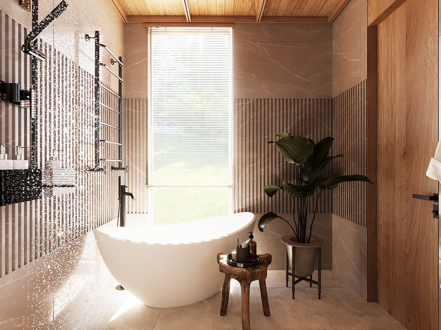 To wnętrze łazienki łączy nowoczesny minimalizm z ciepłymi, naturalnymi akcentami. Subtelne oświetlenie, drewniane elementy oraz pionowa struktura płytek nadają przestrzeni harmonii i elegancji. Wolnostojąca wanna i prysznic typu walk-in tworzą komfortową, relaksującą strefę kąpielową.