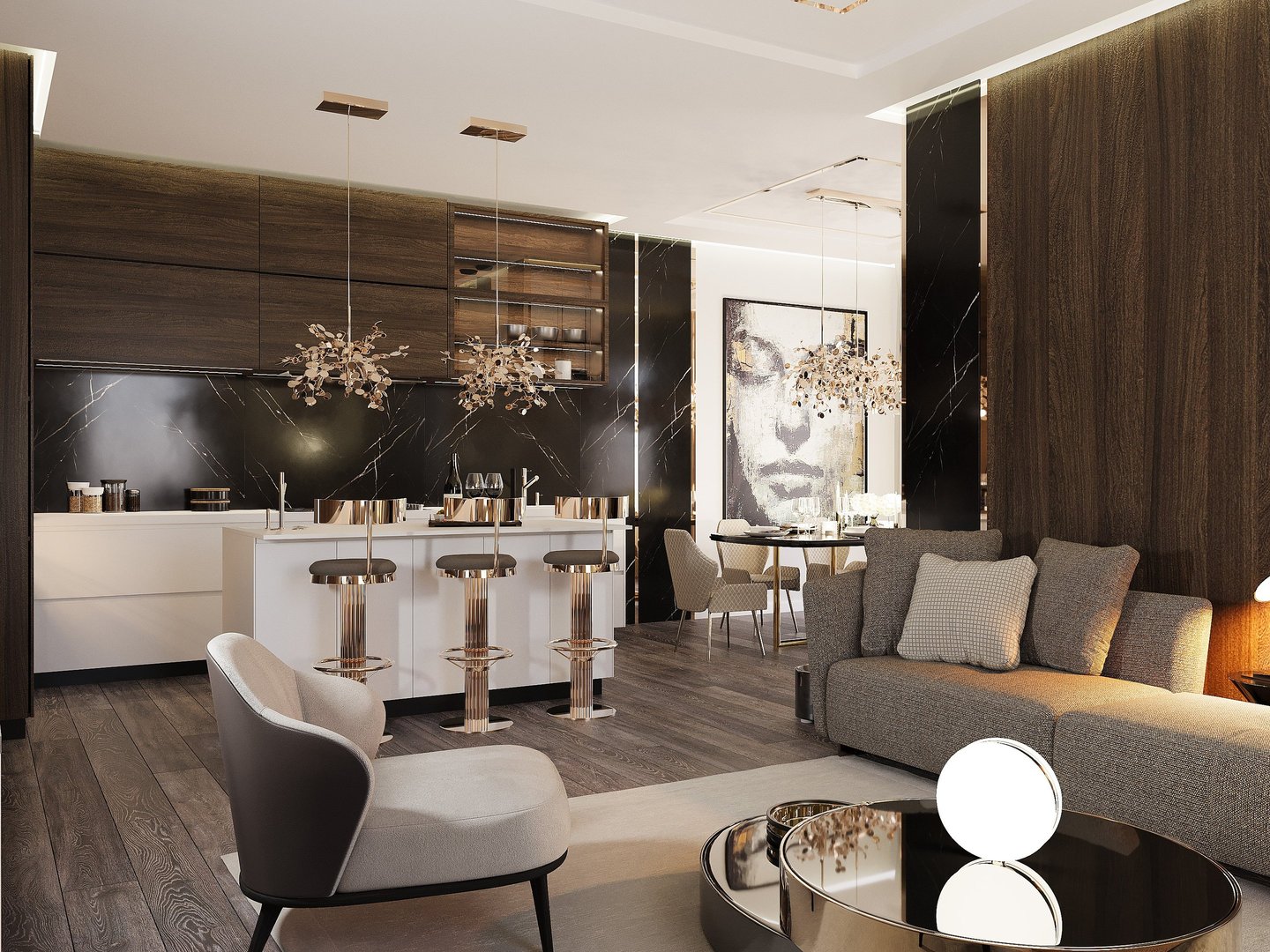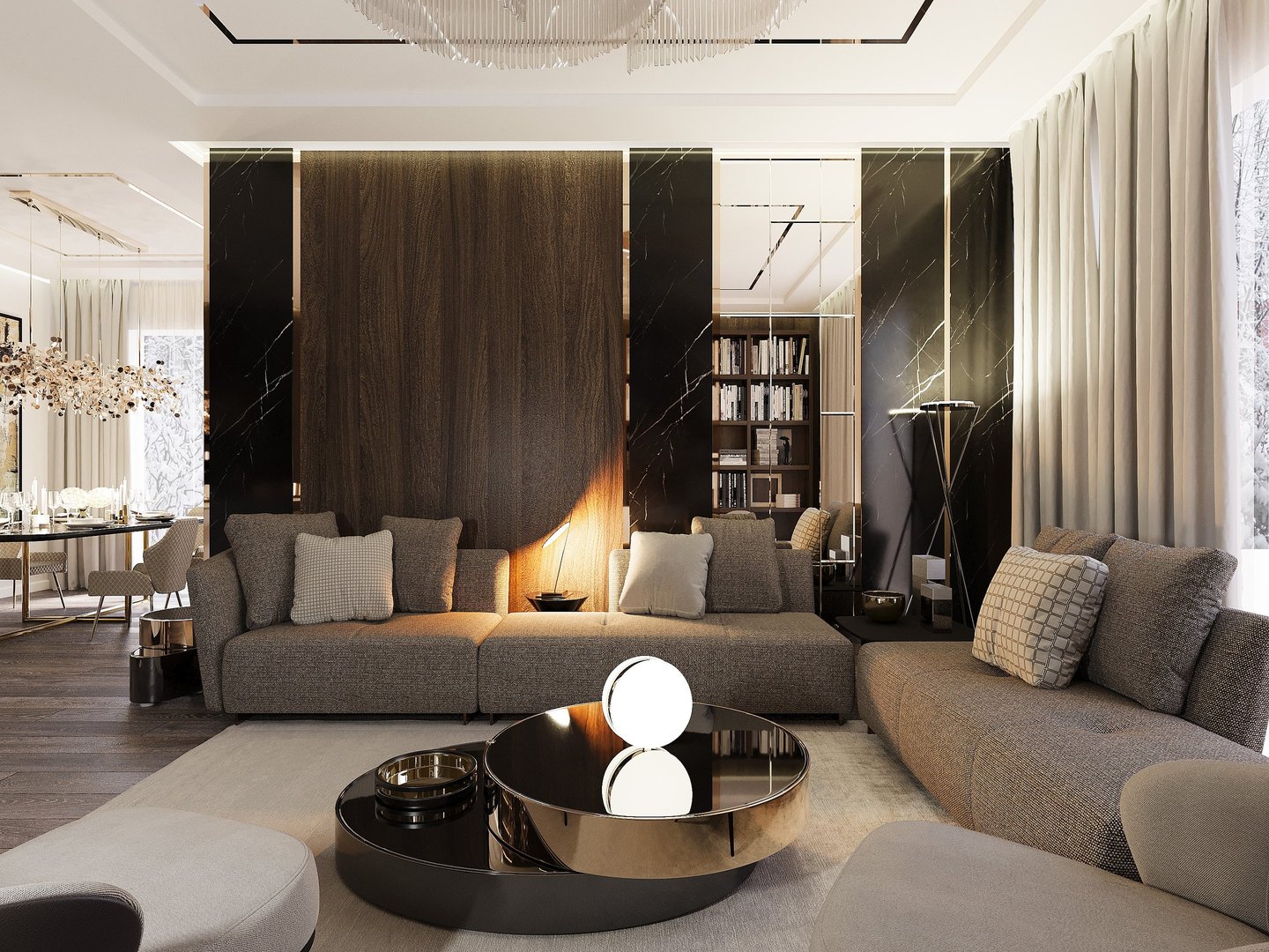 Elegancki salon łączy klasyczne detale z nowoczesnym minimalizmem. Subtelne szarości, sztukateria i artystyczna grafika na ścianie tworzą harmonijną przestrzeń pełną charakteru. Projekt idealny dla miłośników designu, komfortu i wyszukanej estetyki.