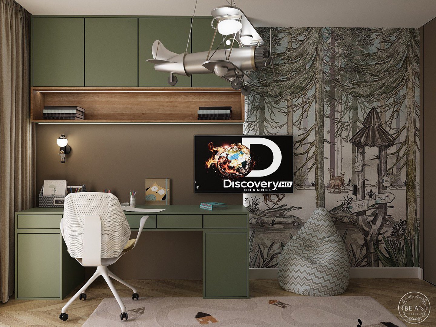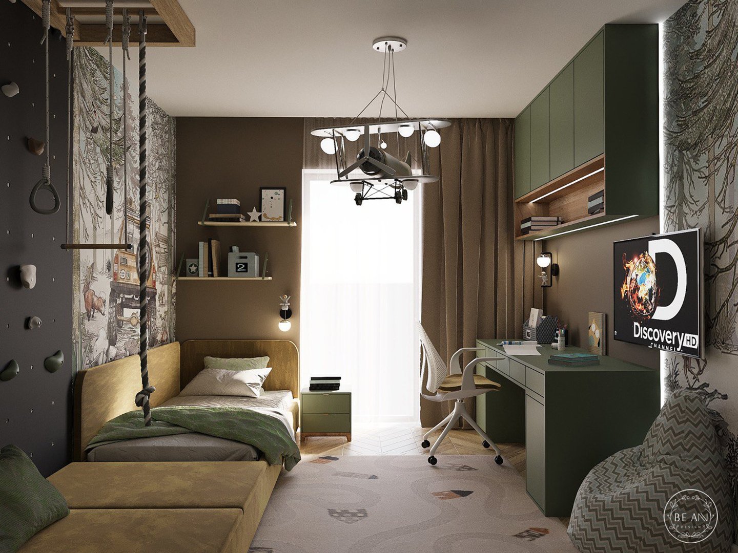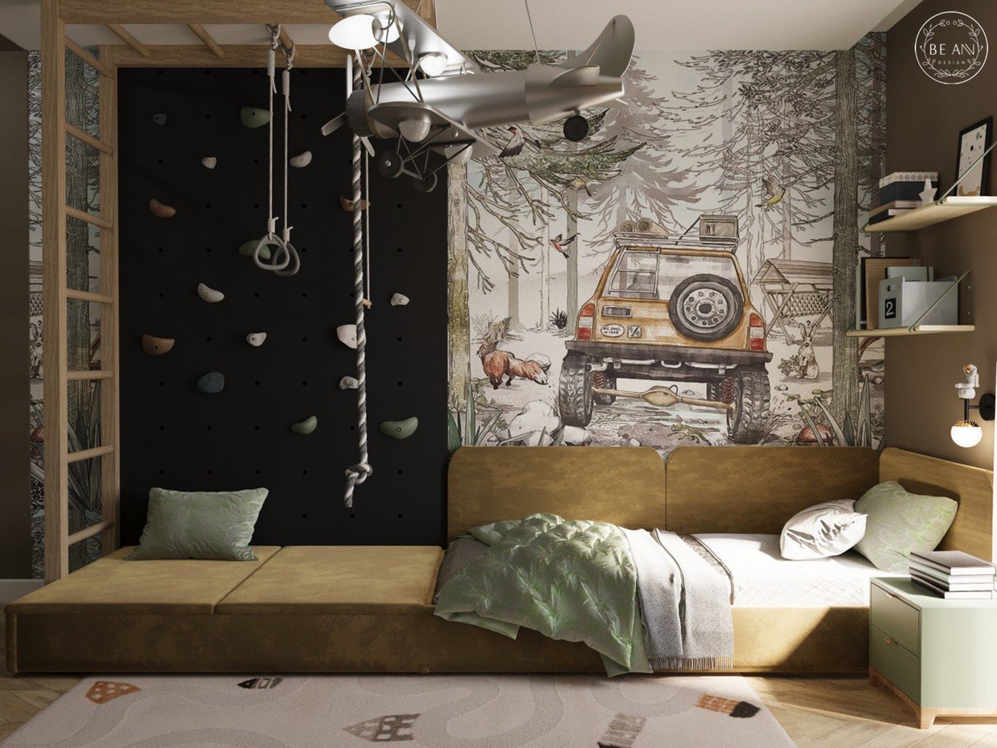 Projekt pokoju dla 8-letniego chłopca, który marzy o przygodach i podróżach. Na ścianie zastosowano fototapetę oraz zamontowano drabinkę gimnastyczną do ćwiczeń. Chłopiec lubi również gry wideo, dlatego naprzeciwko łóżka zawieszono telewizor.