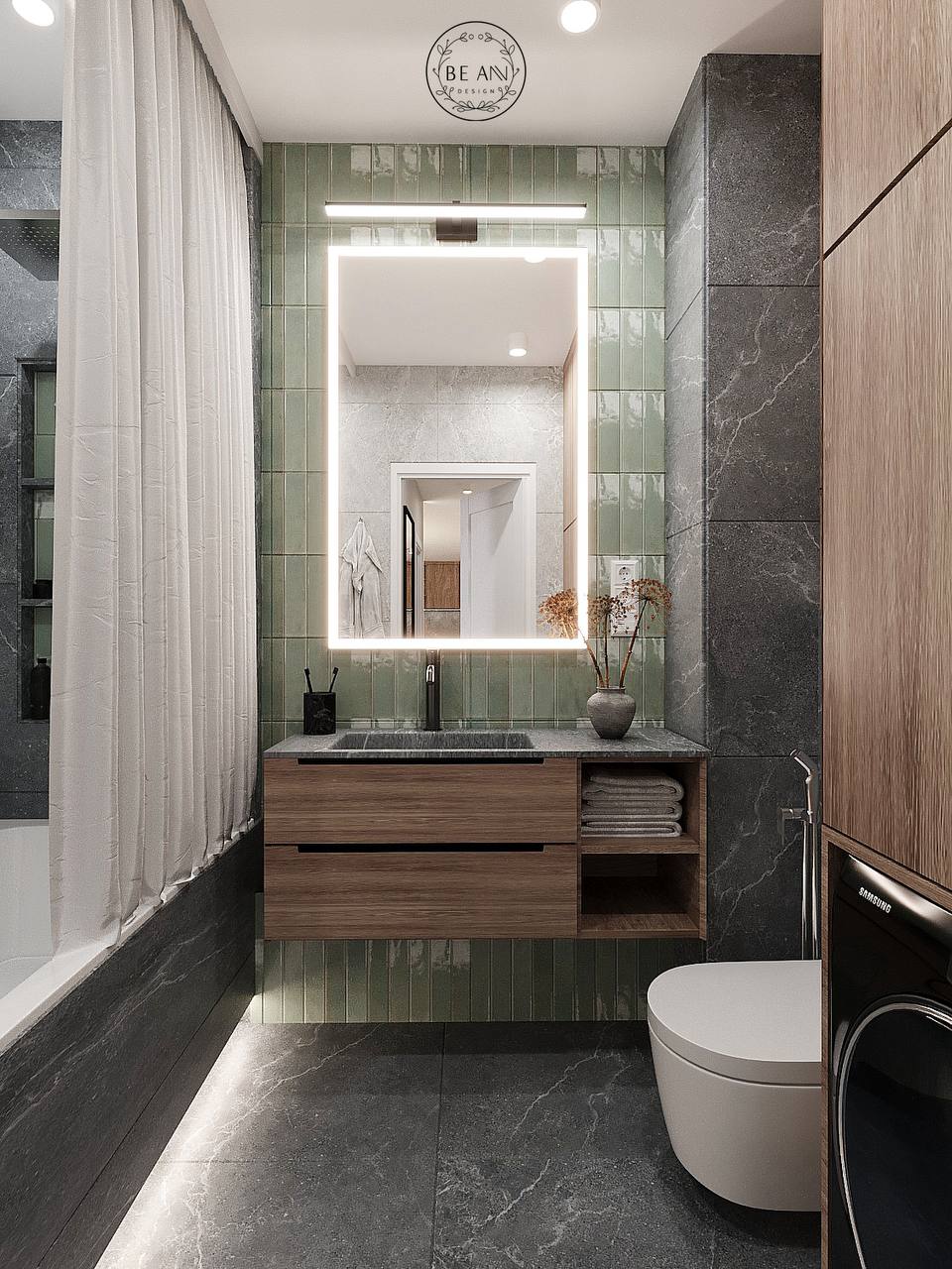 Łazienka utrzymana w szarych tonacjach z akcentową zieloną płytką za lustrem. Pralka została zabudowana w szafie, co pozwoliło uzyskać dodatkowe miejsce do przechowywania. Na niewielkiej powierzchni udało się funkcjonalnie pomieścić wszystkie najpotrzebniejsze elementy.