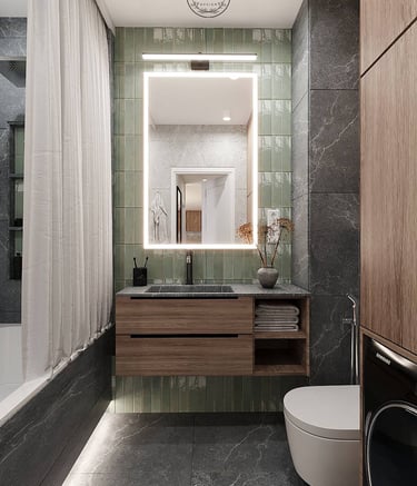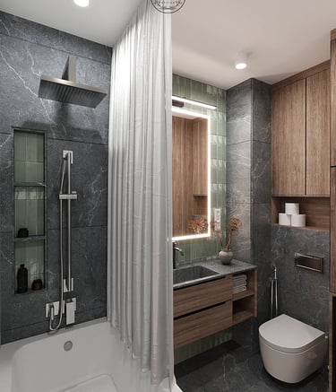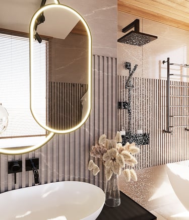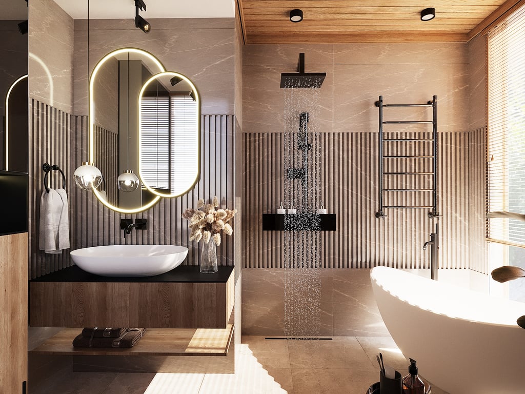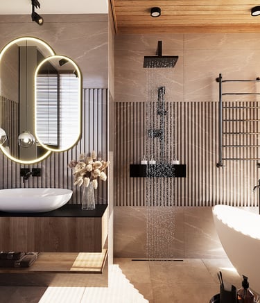 To wnętrze łazienki łączy nowoczesny minimalizm z ciepłymi, naturalnymi akcentami. Subtelne oświetlenie, drewniane elementy oraz pionowa struktura płytek nadają przestrzeni harmonii i elegancji. Wolnostojąca wanna i prysznic typu walk-in tworzą komfortową, relaksującą strefę kąpielową.