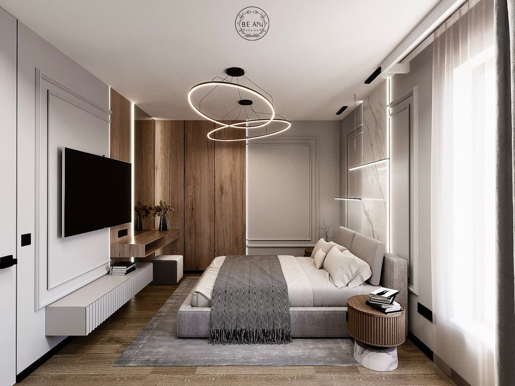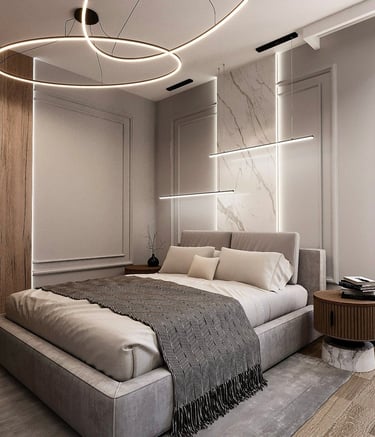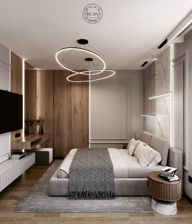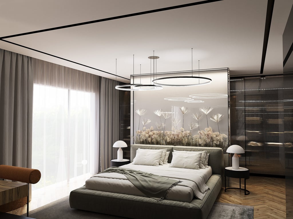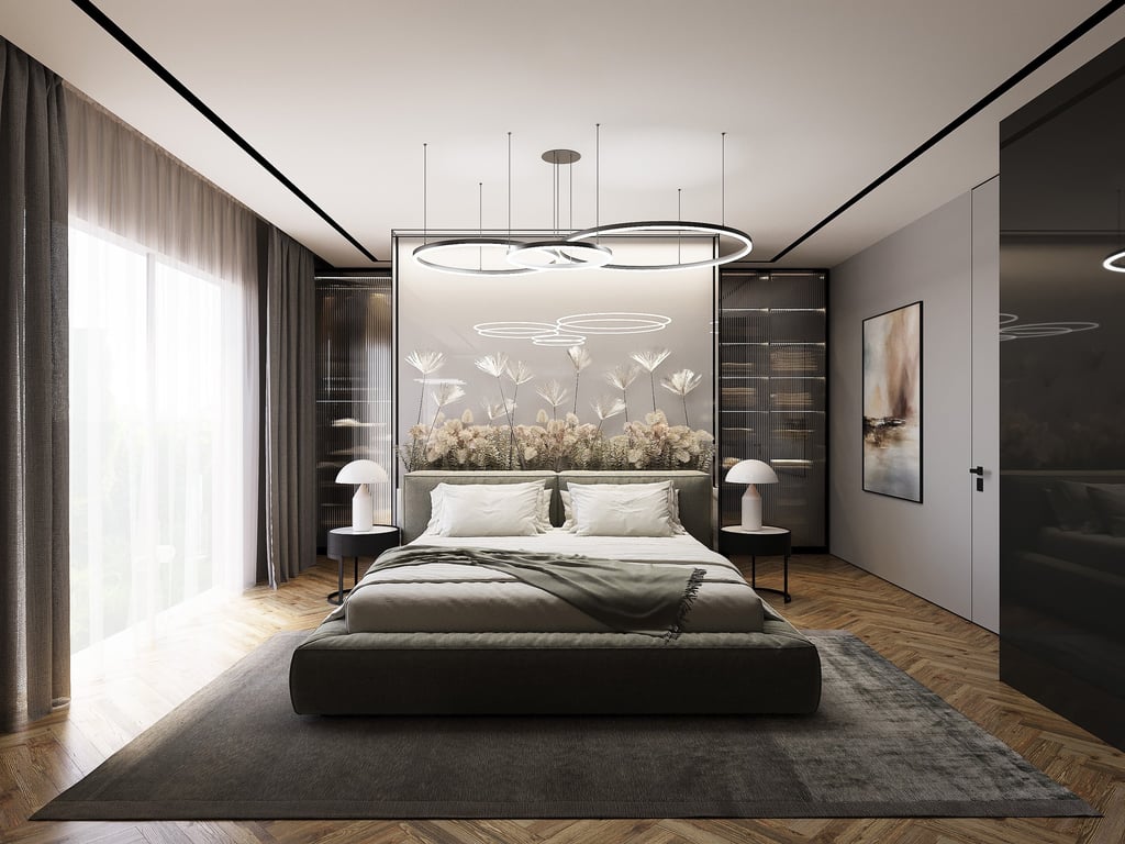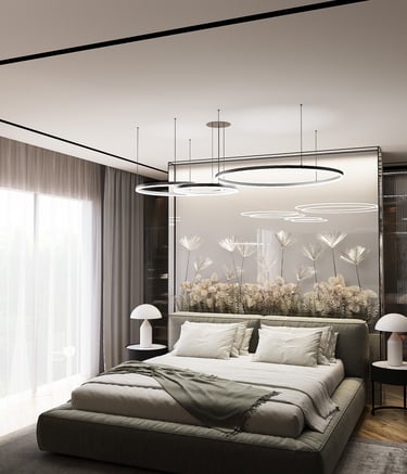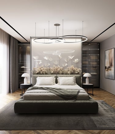 Sypialnia urządzona jest w nowoczesnym, eleganckim stylu z naciskiem na spokój i komfort. Neutralna paleta barw, połączenie drewna, tkanin oraz miękkiego oświetlenia tworzą przytulną atmosferę sprzyjającą odpoczynkowi. Dekoracyjna ściana za łóżkiem z roślinnymi motywami oraz minimalistyczne lampy nadają wnętrzu głębi i wyrafinowanego charakteru.