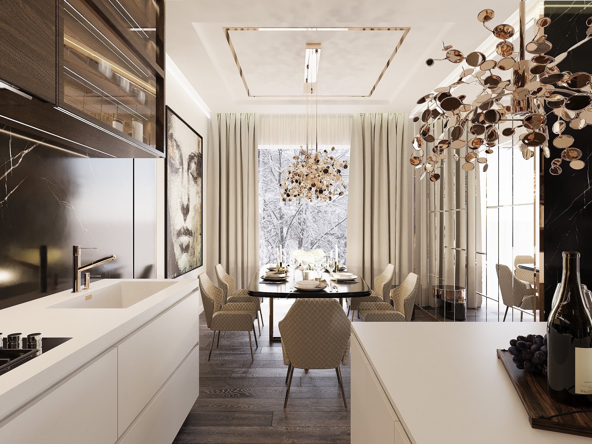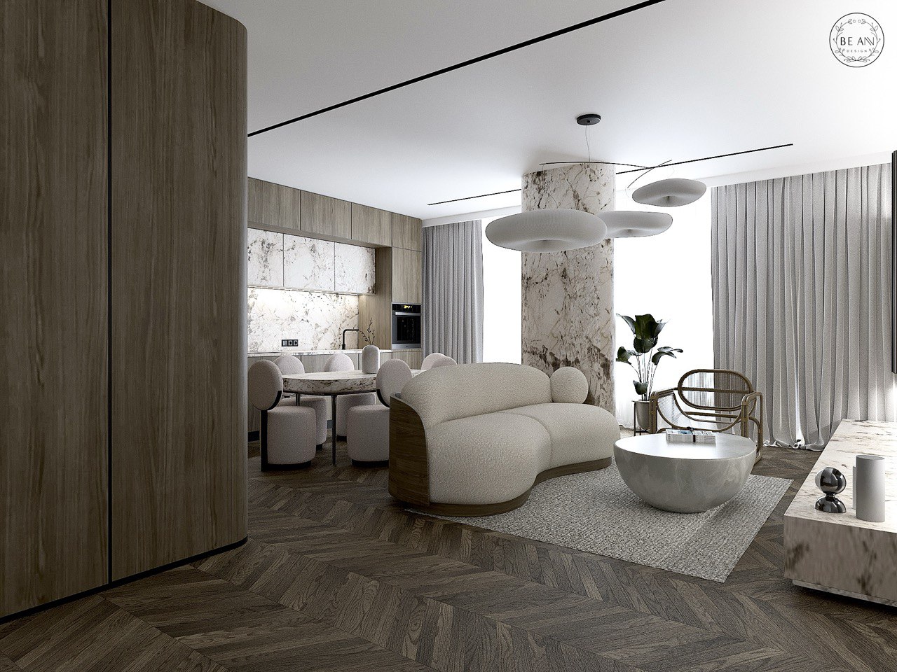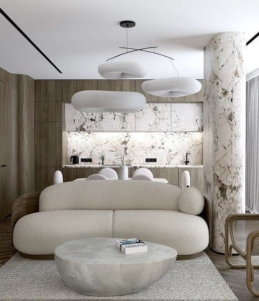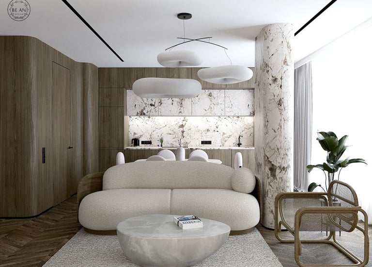 Salon i kuchnia w stylu soft modern. W tym wnętrzu zastosowano modny zabieg zaokrąglonych krawędzi. Przestrzeń wygląda nowocześnie, a jednocześnie jest niezwykle przytulna.