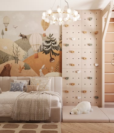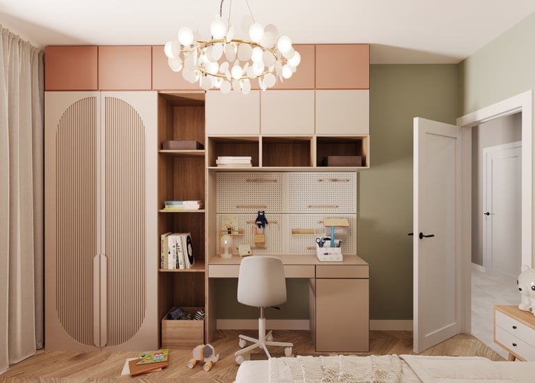 Pokój dla dziewczynki w wieku 2 lat. Zaprojektowany z myślą o przyszłości, tak aby dziecko mogło czuć się komfortowo w tej przestrzeni aż do momentu, gdy stanie się nastolatką. Wnętrze utrzymane jest w ponadczasowym stylu, z wykorzystaniem przyjemnych, stonowanych kolorów. Dodatkowo w pokoju znajduje się kącik sportowy przeznaczony do zabawy i aktywności fizycznej.