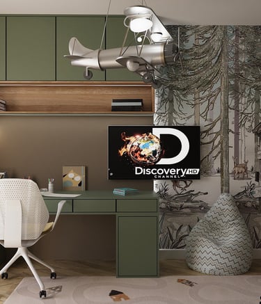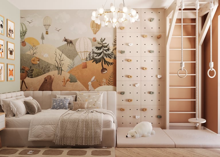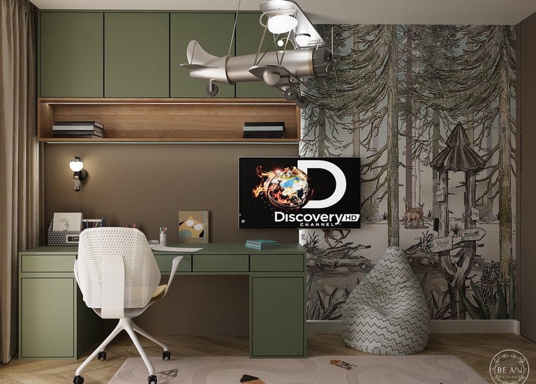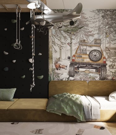 Projekt pokoju dla 8-letniego chłopca, który marzy o przygodach i podróżach. Na ścianie zastosowano fototapetę oraz zamontowano drabinkę gimnastyczną do ćwiczeń. Chłopiec lubi również gry wideo, dlatego naprzeciwko łóżka zawieszono telewizor.