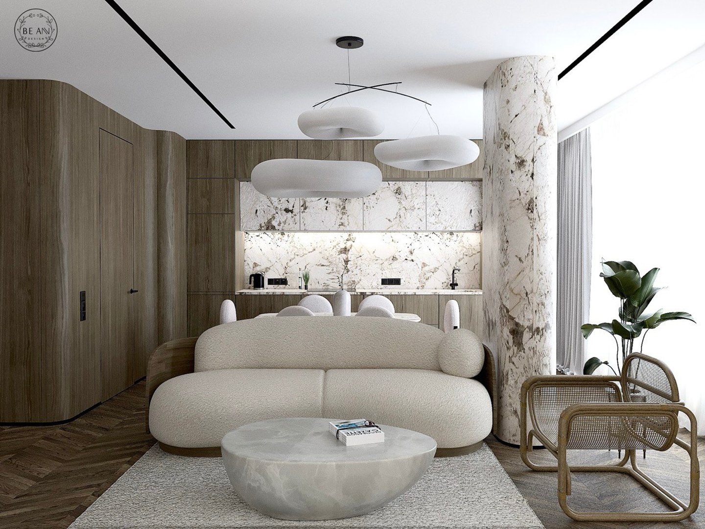 Salon i kuchnia w stylu soft modern. W tym wnętrzu zastosowano modny zabieg zaokrąglonych krawędzi. Przestrzeń wygląda nowocześnie, a jednocześnie jest niezwykle przytulna.