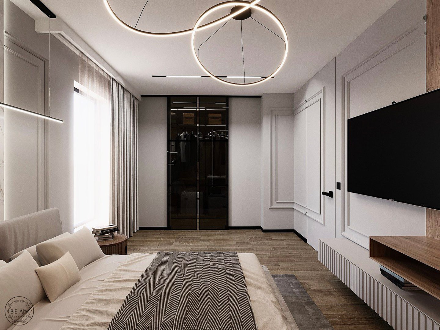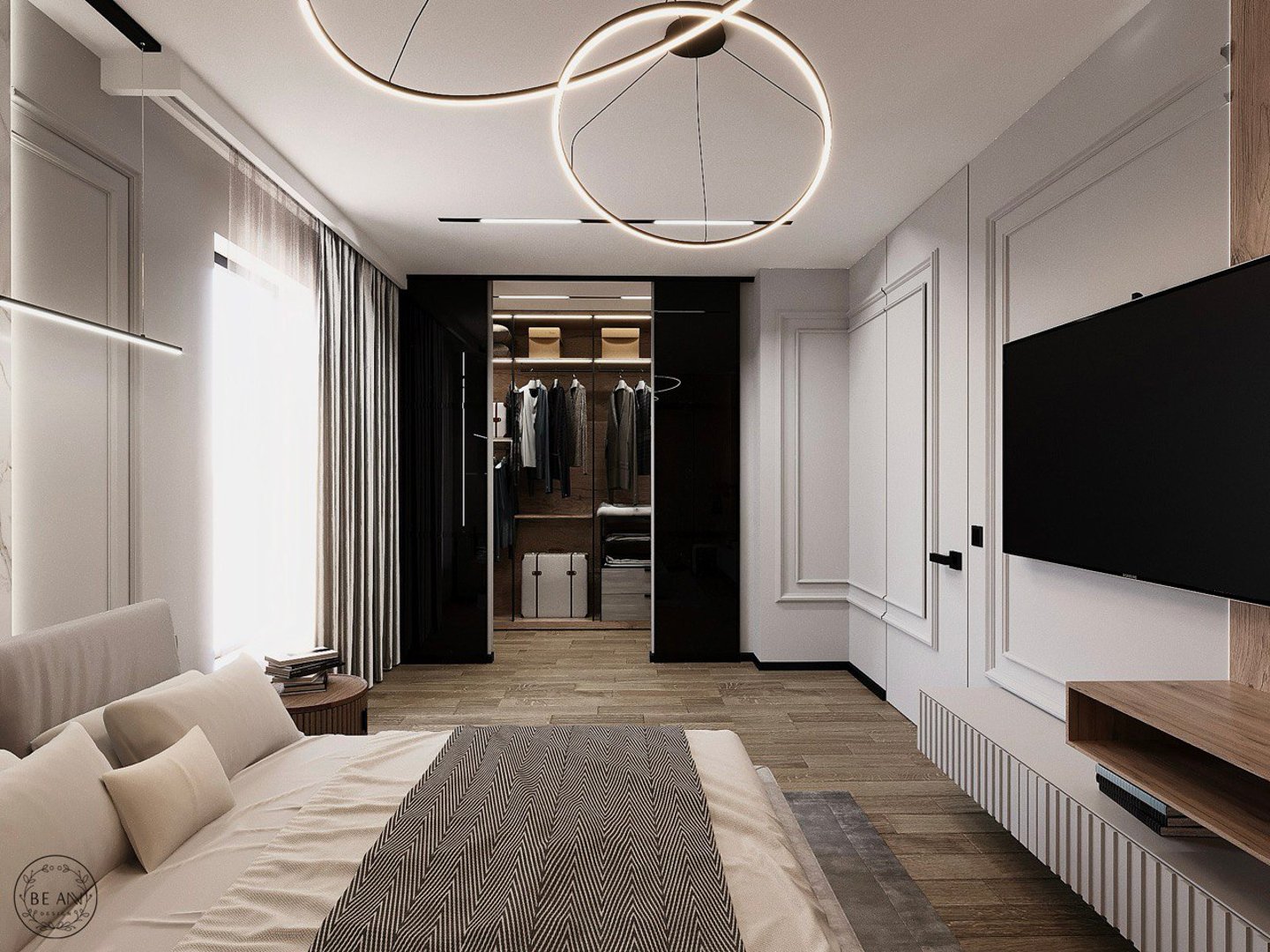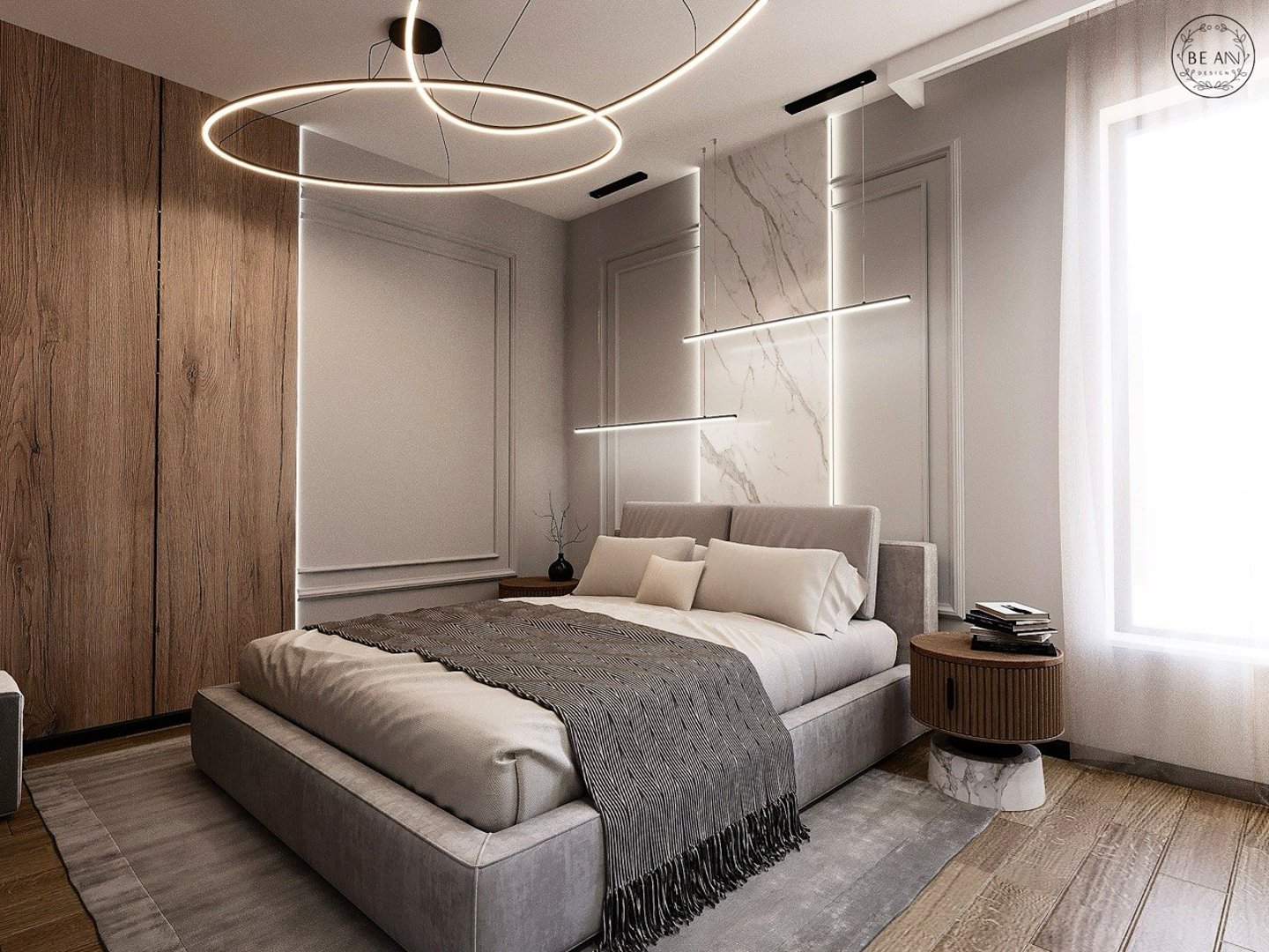 Sypialnia w stylu minimalistycznym, z wykorzystaniem naturalnych materiałów na podłodze i ścianach. W sypialni znajduje się również przestronna garderoba, ukryta za systemem drzwi przesuwnych.